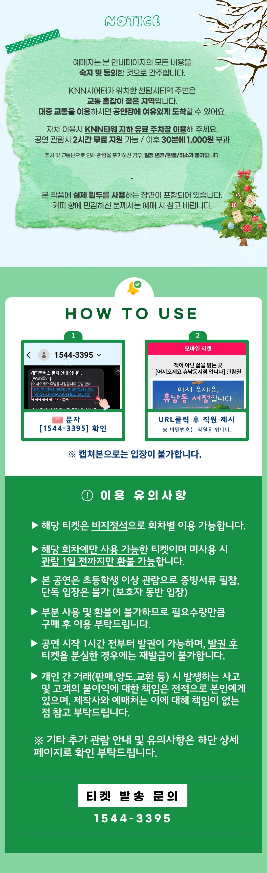 - 관람일 잘못 지정, 전화번호 오기입 등의 사유라도 관람 1일전까지만 환불 가능하오니 반드시 구매 시 유의바랍니다.